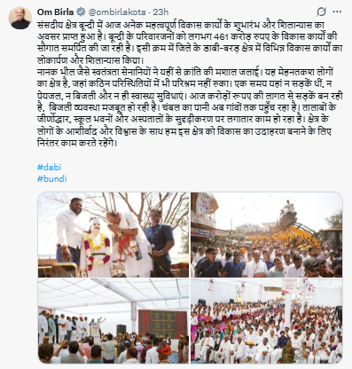 कार्यक्रम में उपस्थित आमजन को संबोधित करते हुए लोकसभा अध्यक्ष ने कहा कि डाबी एक पत्थर खनन क्षेत्र है, जहां लोगों को कड़ी मेहनत करने के बाद ही रोजी-रोटी मिल पाती है। उन्होंने पिछली सरकारों पर निशाना साधते हुए कहा कि पिछले 70 सालों में यह क्षेत्र विकास कार्यों के मामले में सबसे पिछड़ा रहा था। लेकिन हमारी सरकार ने कोटा, बिजौलिया, भीलवाड़ा और चित्तौड़ जिले की सीमाओं को जोड़ने वाले नेशनल हाईवे की बेहतरीन सुविधा उपलब्ध कराई है। इसके अलावा अब क्षेत्र के गांव-गांव में अस्पताल और सुचारू बिजली आपूर्ति की सुविधाएं भी लोगों को मिल रही हैं।