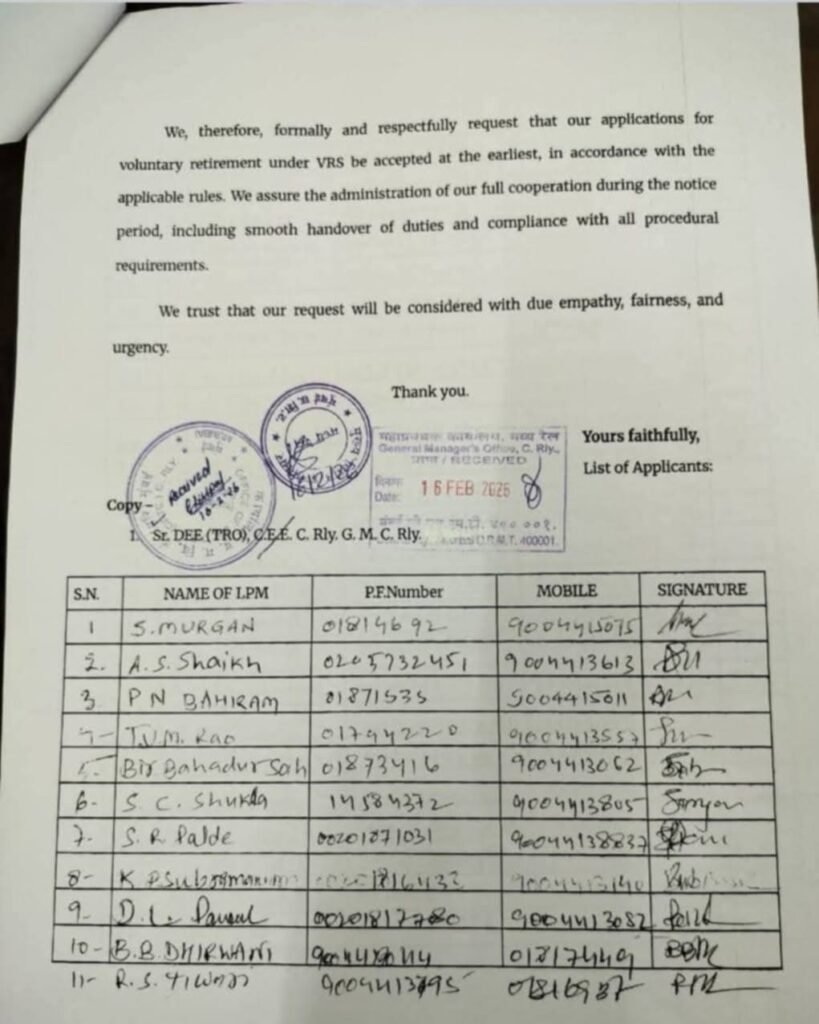 मुंबई (CSMT): मध्य रेलवे के मुंबई डिवीजन में एक अभूतपूर्व स्थिति पैदा हो गई है। 16 फरवरी 2026 को करीब 72 मेल लोको पायलट (Loco Pilot Mail) ने एक संयुक्त आवेदन जमा कर सामूहिक रूप से स्वैच्छिक सेवानिवृत्ति (VRS) की मांग की है। विभागीय रेलवे प्रबंधक (DRM) को संबोधित इस आवेदन में कर्मचारियों ने काम के दमघोंटू माहौल, खराब सुविधाओं और बढ़ते प्रशासनिक दबाव को अपनी इस मजबूरी का मुख्य कारण बताया है।