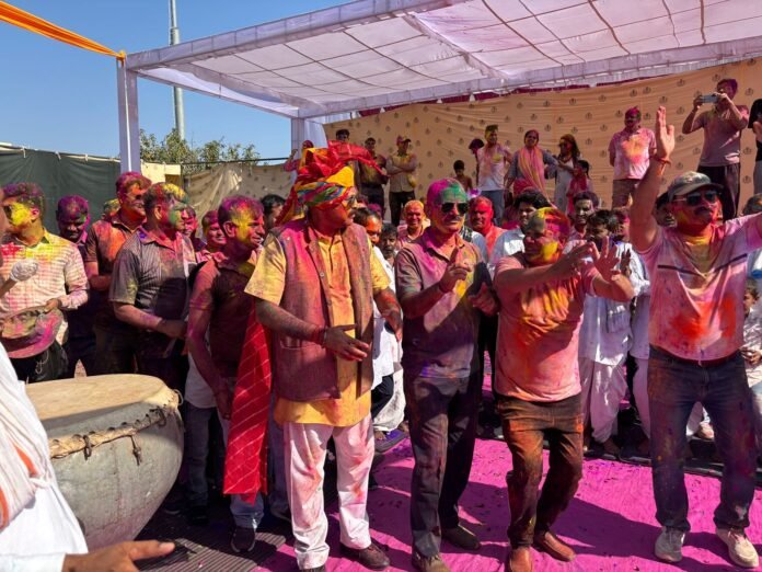 करौली। आमजन की सुरक्षा के लिए धुलंडी के दिन मुस्तैद रहने वाली पुलिस ने मंगलवार को करौली पुलिस लाइन और विभिन्न थानों में हर्षोल्लास के साथ होली का त्योहार मनाया। पुलिस लाइन में आयोजित मुख्य समारोह में जिले के आला अधिकारियों ने जवानों के साथ मिलकर गुलाल उड़ाया और ‘टाईगर’ (SP) संग होली खेलने का उत्साह पुलिसकर्मियों के चेहरों पर साफ नजर आया।