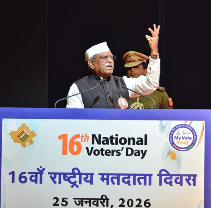 जयपुर, भारत निर्वाचन आयोग के स्थापना दिवस के उपलक्ष्य में रविवार को जयपुर में 16वां राष्ट्रीय मतदाता दिवस समारोह धूमधाम से मनाया गया। “मेरा भारत, मेरा वोट” थीम पर आयोजित इस राज्य स्तरीय समारोह में राज्यपाल श्री हरिभाऊ बागडे मुख्य अतिथि के रूप में शामिल हुए। उन्होंने अपने उद्बोधन में लोकतंत्र की जड़ें मजबूत करने और प्रत्येक नागरिक की मतदान में भागीदारी सुनिश्चित करने का आह्वान किया।