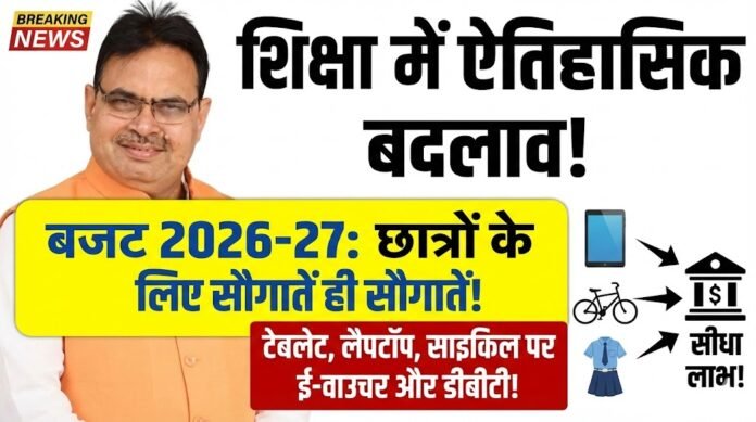 छात्रों को सीधा लाभ: टैबलेट, साइकिल और यूनिफॉर्म के लिए कैश बजट 2026-27 में छात्रों के लिए डीबीटी (Direct Benefit Transfer) और ई-वाउचर (E-Voucher) की बड़ी घोषणाएं की गई हैं:
