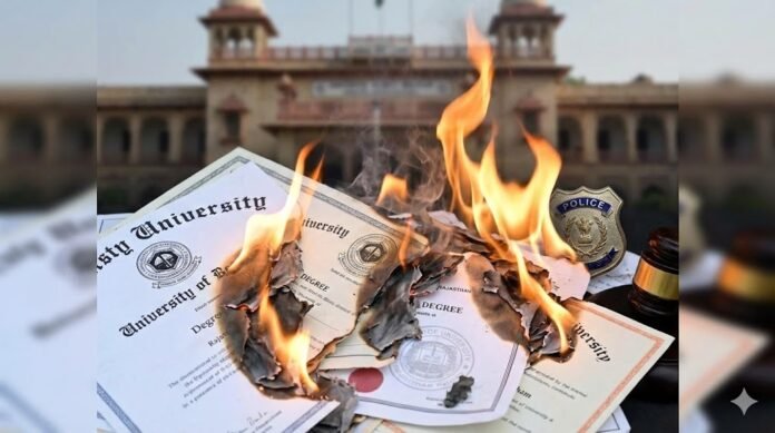 जोधपुर नेशनल यूनिवर्सिटी (Jodhpur National University) का बहुचर्चित डिग्री कांड एक दशक बाद भी अनसुलझा है । एसओजी की कार्रवाई के बावजूद करीब 25 हजार फर्जी डिग्रियां आज कहां हैं, इसका किसी के पास जवाब नहीं है । ये डिग्रियां न तो रद्द की गईं और न ही नष्ट की गईं, जिससे इनके भविष्य में दुरुपयोग का खतरा बना हुआ है ।