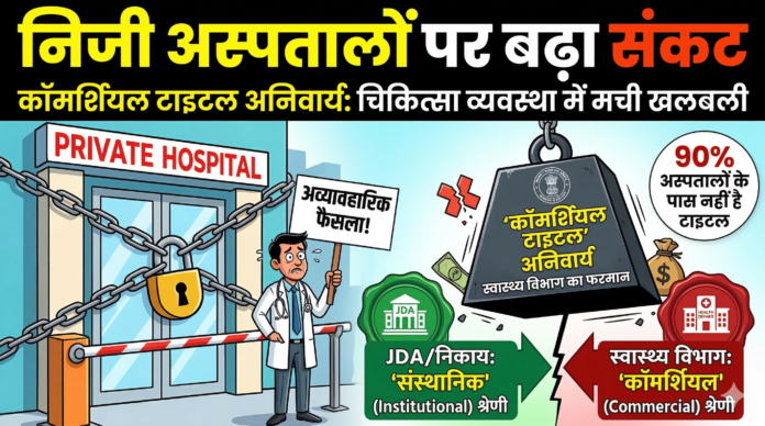 जयपुर: राजस्थान के स्वास्थ्य विभाग द्वारा हाल ही में लिए गए एक निर्णय ने प्रदेश के निजी चिकित्सा क्षेत्र में एक बड़ा विवाद खड़ा कर दिया है। विभाग ने सरकारी योजनाओं (जैसे आयुष्मान भारत-राजस्थान मुख्यमंत्री आयुष्मान आरोग्य योजना) के पैनल में शामिल होने के लिए निजी अस्पतालों के पास ‘कॉमर्शियल टाइटल’ (Commercial Title) होना अनिवार्य कर दिया है। सरकार के इस कदम से हजारों अस्पतालों के संचालन और उनके पैनल से बाहर होने का खतरा पैदा हो गया है।