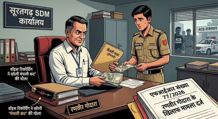 सूरतगढ़/श्रीगंगानगर । श्रीगंगानगर जिले के सूरतगढ़ उपखंड अधिकारी (SDM) कार्यालय में होमगार्ड जवानों की सैलरी पास करने के नाम पर ‘मंथली कट’ (मासिक घूस) मांगने का एक चौंकाने वाला मामला सामने आया है । भ्रष्टाचार निरोधक ब्यूरो (ACB) ने एसडीएम कार्यालय के वरिष्ठ सहायक (बाबू) के खिलाफ भ्रष्टाचार का मुकदमा दर्ज किया है । दिलचस्प बात यह है कि आरोपी बाबू को एसीबी के जाल का पहले ही शक हो गया था, लेकिन उसकी खुद की आवाज़ ने उसे कानून के शिकंजे में फंसा दिया ।